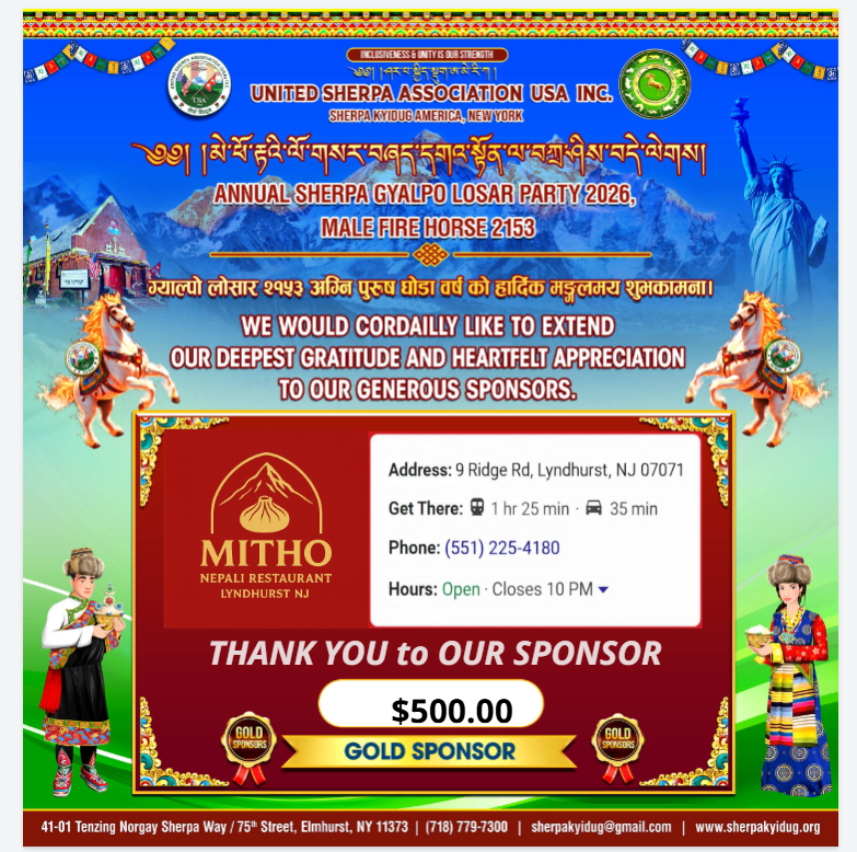 On behalf of the United Sherpa Association (USA) Inc. / Sherpa Kyidug America – New York and the Losar Management Team 2026, we extend our sincere gratitude to all our Diamond, Platinum, Gold, Silver, and Individual Sponsors for your generous support of the Annual Sherpa Gyalpo Losar Party 2026 (Year of the Fire – Male Horse 2153), held on March 7, 2026.